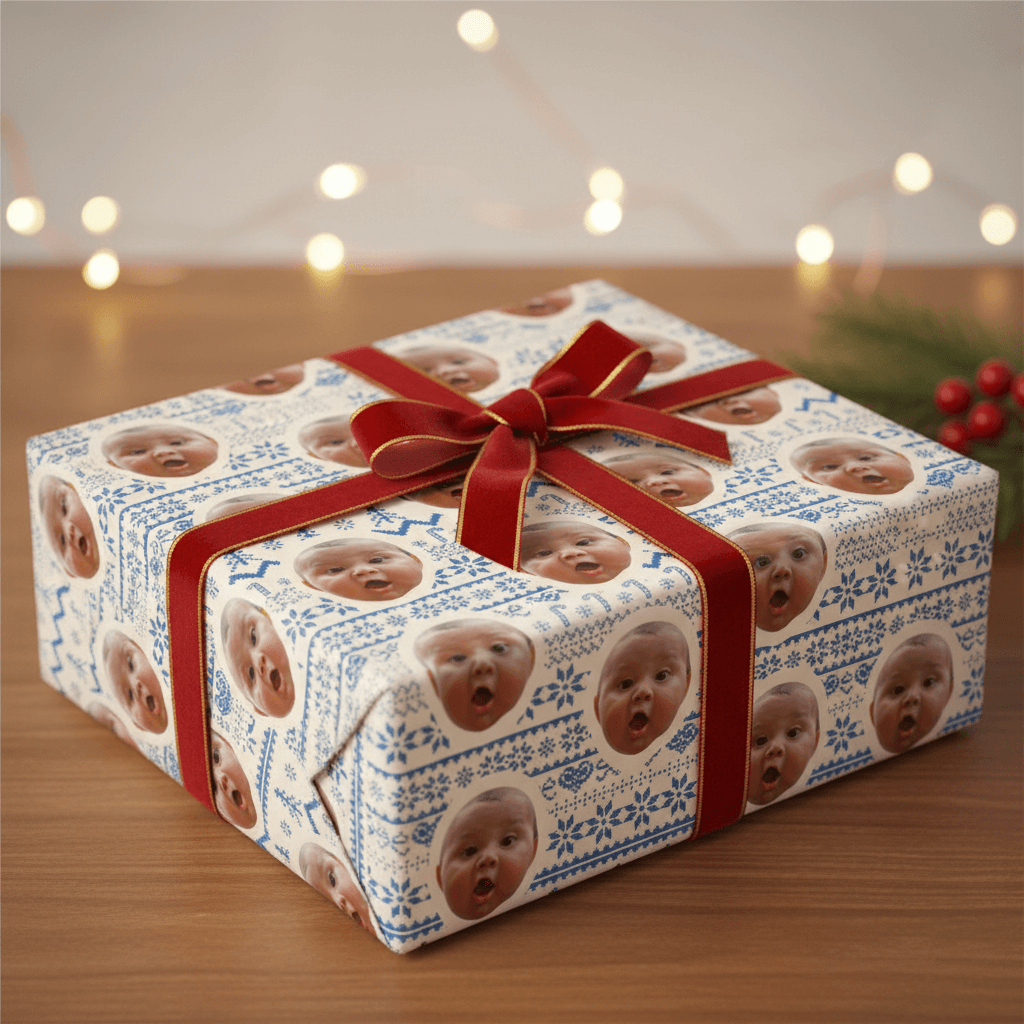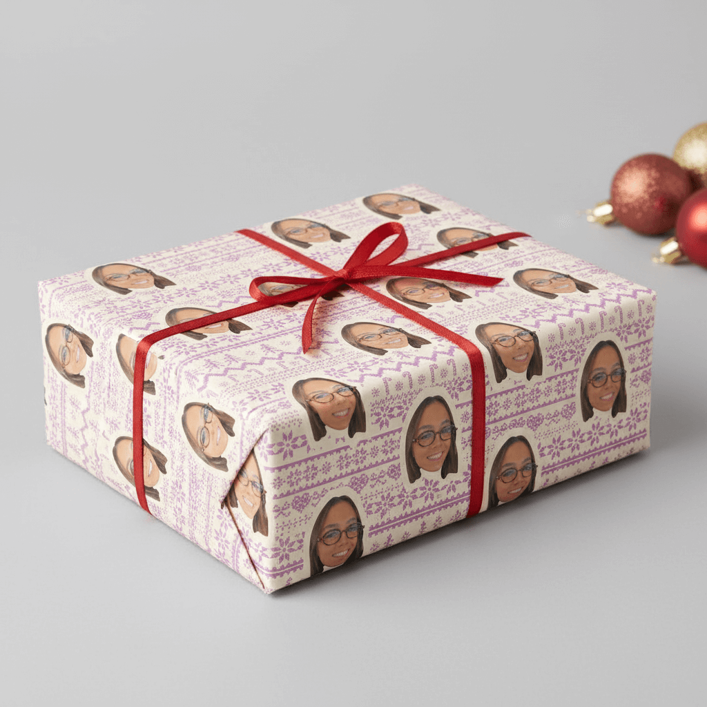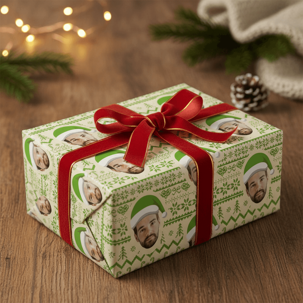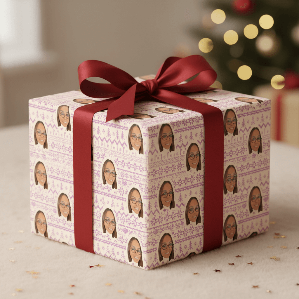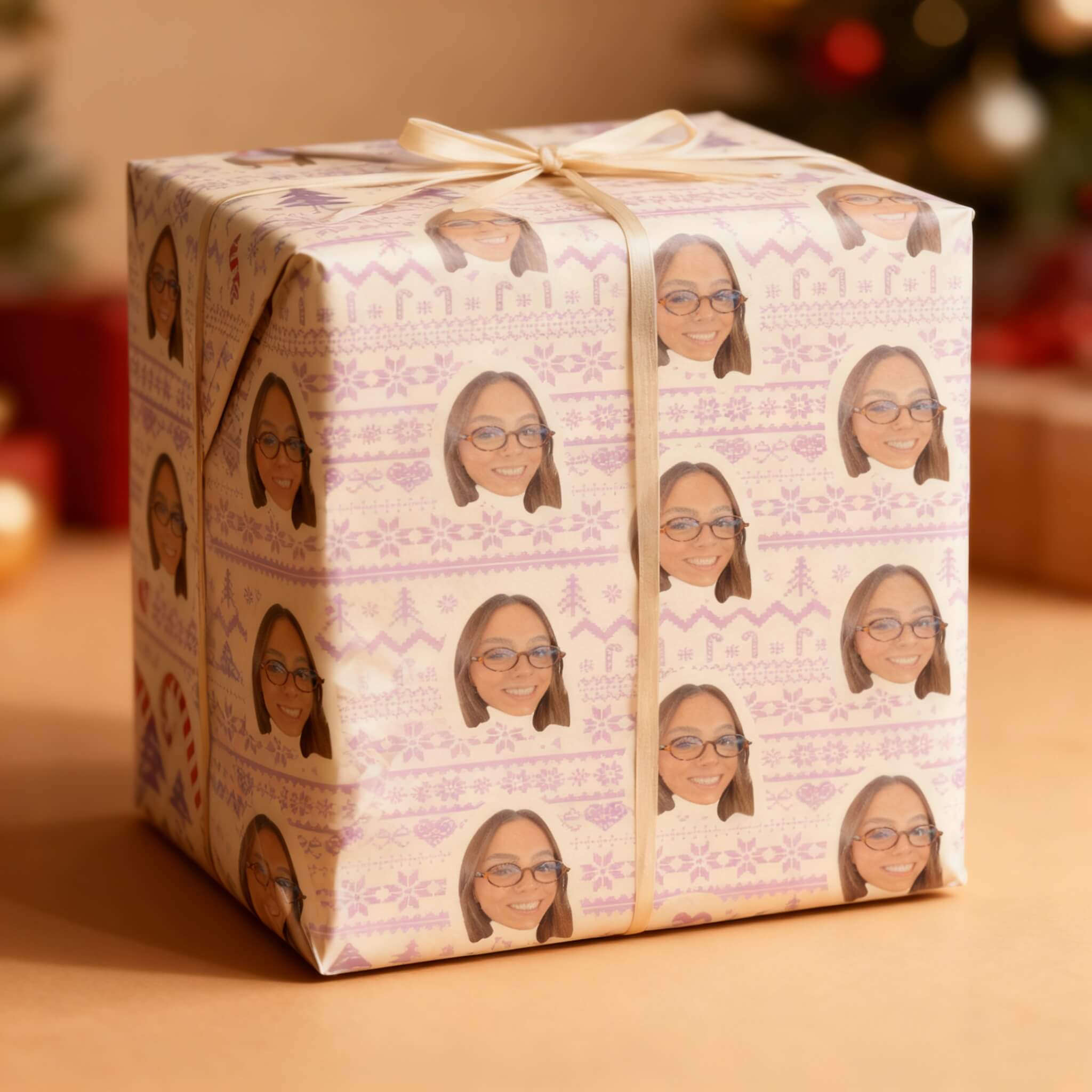 Idéal pour les fêtes de fin d’année, ce papier cadeau rend chaque présent mémorable : faites imprimer les visages de vos proches, amis ou collègues, et ajoutez une touche encore plus festive avec notre option bonnet de Noël ou chapeau de fête.